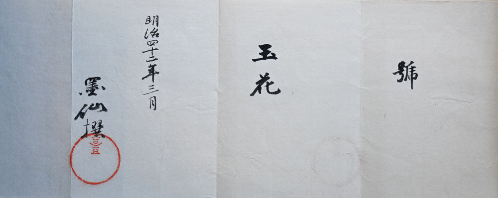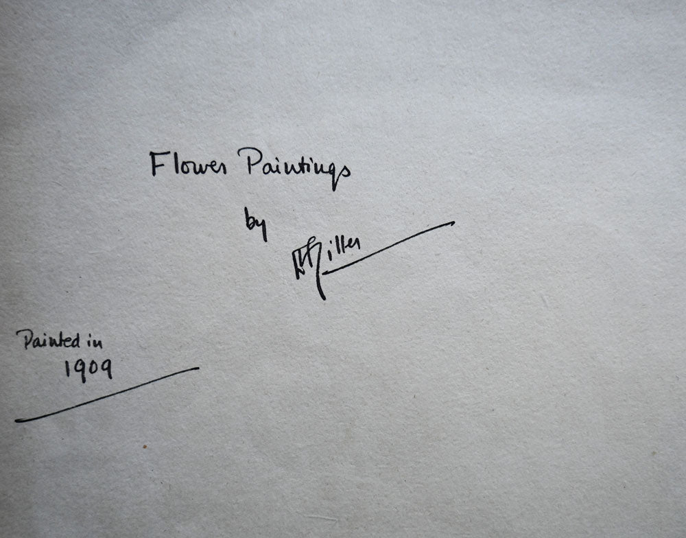 Completed at the age of 14 (1909), this set of four original paintings are the earliest known works by Lilian Miller. The album of four flower basket paintings propelled Miller's teacher, Shimada Bokusen to gift her the name, "Gyokka joshi" (Miss Jeweled Flower); as referenced in the Brown catalog on page 14. Only a handful of known Miller works still exist with this scarce early "Gyokka joshi" artist signature.