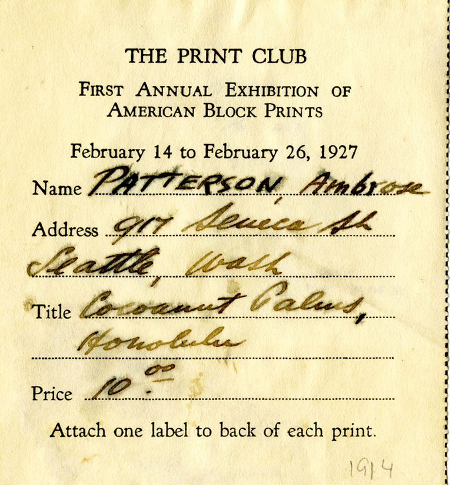 He arrived in Hawaii in 1916 on a stopover from Sydney to New York and decided to stay with a Parisian friend living in Honolulu. During the next 18 months, Patterson made block prints and paintings with particular interest in Kilauea. His art was included in the Hawaiian Society of Artists Annual in 1917. He left for California in 1918 and settled in Seattle. At the 1918 Spring Annual of the San Francisco Art Association (SFAA) his wood block prints were said to be "especially fine in color." That summer his art was given a one-man exhibition at the SFAA galleries, and he contributed three color prints to the Seventh Annual of the California Society of Etchers.