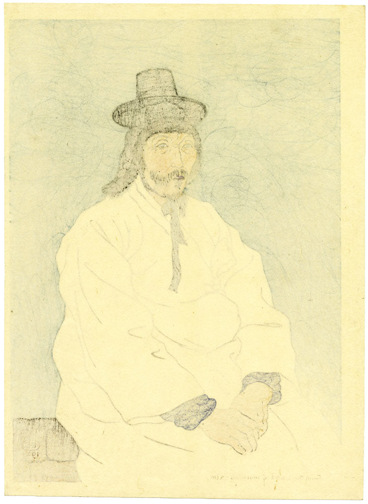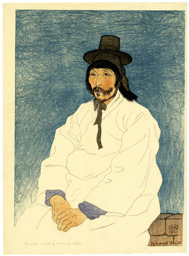 "A lower middle-class citizen of Seoul wearing his fur-lined winter hat. On top of this is worn the usual hat of horsehair. The outer garment is of white cotton, padded for the elements of winter." - Miles, pg.49 p>