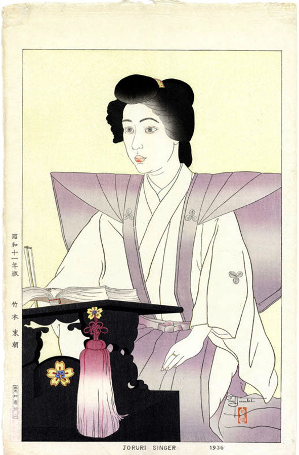 The model, "Tocho", was a well-known cabaret performer who befriended Jacoulet at an early age and taught him many of the songs that he enjoyed singing during his stay in Japan. Exquisite coloring throughout and remarkable gauffrage within the beige robe. The print exists in only a few examples, with far less in very fine overall condition.