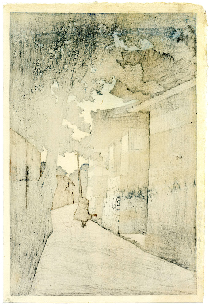 An extremely rare and elusive work, that was completed prior to the Great Kantō Earthquake in 1923. Likely, a very low print run due to the less appealing mood of this image, when compared to other commercially successful designs from the same period.