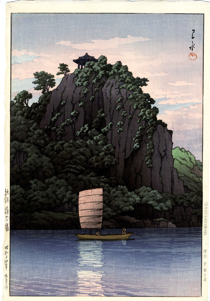 Eight view of Korea: These prints resulted from a trip Hasui made to Korea in 1939, together with the artists Ikegami Shuho, Yazawa Gengetsu, Nagata Shunsui, and Yamakawa Shuho. The prints were published by Kansai Bijutsusha in Osaka headed by Naito Seifu, but produced by Watanabe Shozaburo. Narazaki writes: 'Hasui's trip to Korea served to refresh the artist, whose art had been stagnating for some time. The scenery and customs that Hasui witnessed in Korea marked an artistic turning point for the artist.