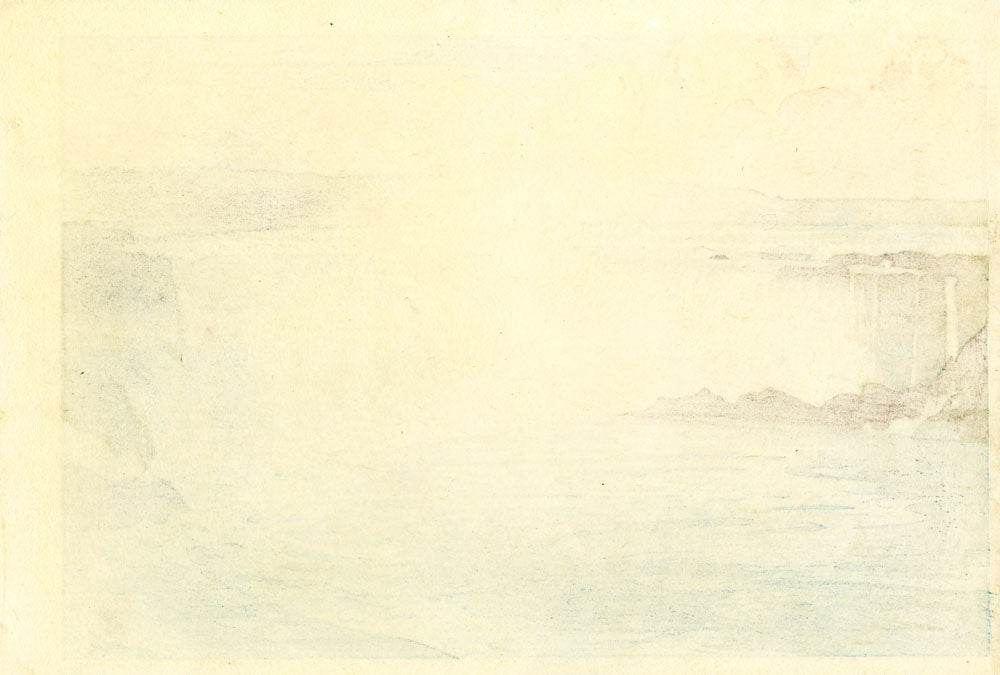 An early, Japanese edition. Signed in sumi ink Yoshida with artist's seal Hiroshi, with red jizuri (self-printed) seal on left margin, followed by the date Taisho juyonen saku (made in Taisho 14 [1925]), followed by the Japanese title, Naiagura bakufu. For the print, "Niagara Falls", Yoshida effortlessly layers light and dark contrasts of water in the foreground against the soft pink mist drifting upwards towards tufts of pale cotton candy pink and lavender clouds.