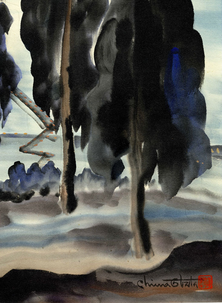 His sumi was of a type made in the mountains of Japan from a secret slow-burning carbonization of pine; his brushes were constructed by hand with animal furs such as rabbit, fox, sheep, badger, and bear. Even Obata's water came from the purest sources he could find, preferably mountain lakes and streams. In the 1930's he made pilgrimages to Fern Spring in Yosemite Valley to collect its crystalline water, which he used to mix with his sumi.