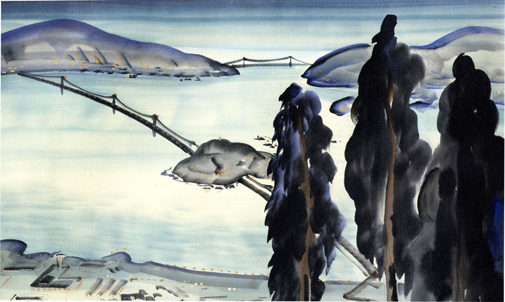 Signed in black ink with artist red seal; lower right. A scenic view of San Francisco that includes Treasure Island (Yerba Buena Island) and both the Golden Gate and Bay Bridge. The Port of Oakland is also captured in the lower segment of the painting, with towering eucalyptus trees dominating the right portion of the work. Provenance: Nikko Art Gallery, Berkeley California. Previously owned by an ex-student of Mr. Obata.