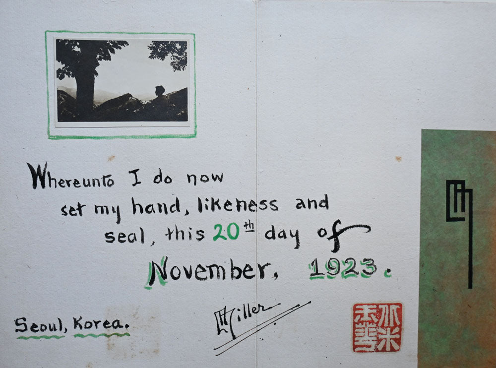 The handcrafted book was created by Lilian Miller as a wedding gift for her sister, Harriet Miller (Cooper) on her wedding day - June 16th, 1923. The handmade book includes gilded edges of gold leaf. All the original paintings are in beautiful untouched condition. Every painting is signed with the artist monogram as well. In total, there are eight artist signatures throughout this one-of-a-kind piece. The final page includes an original black and white photograph of Miller at one of her favorite locations in the Korean mountainside.