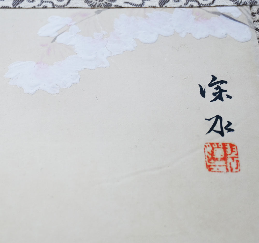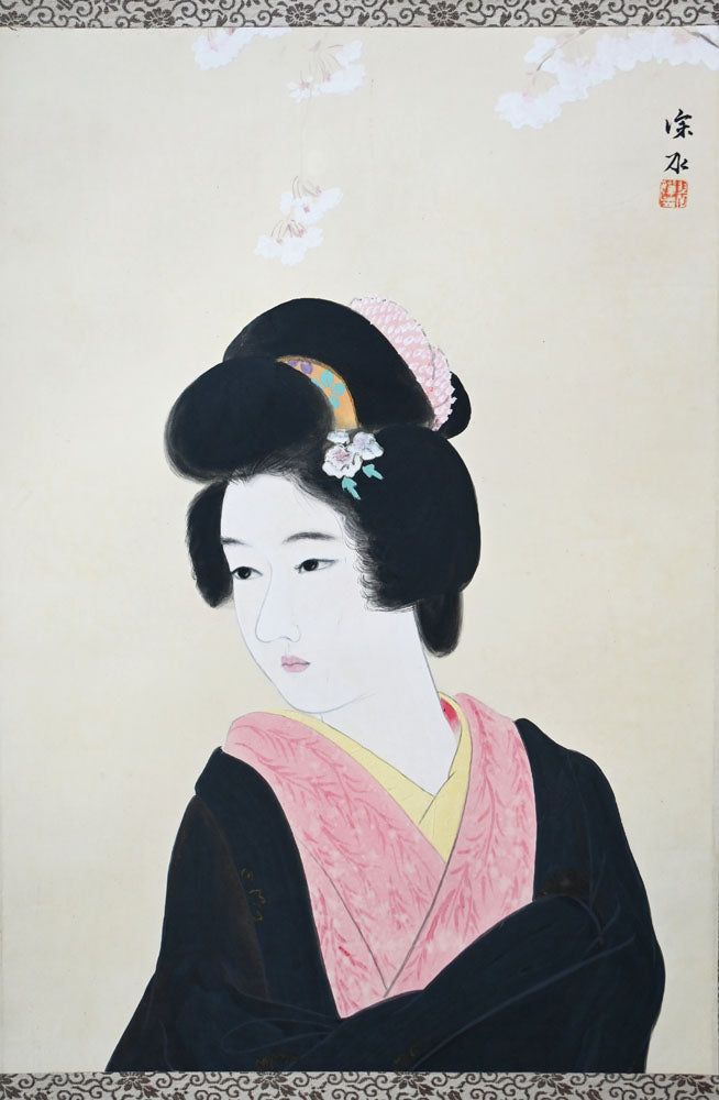 Signed: Shinsui; with red artist chop. The original painting of a beauty under cherry blossoms displays stunning execution and superb colors throughout this intricately detailed work of art. The artist has also applied gold metallic ink on the black portion of the kimono and kanzashi (hair ornament).