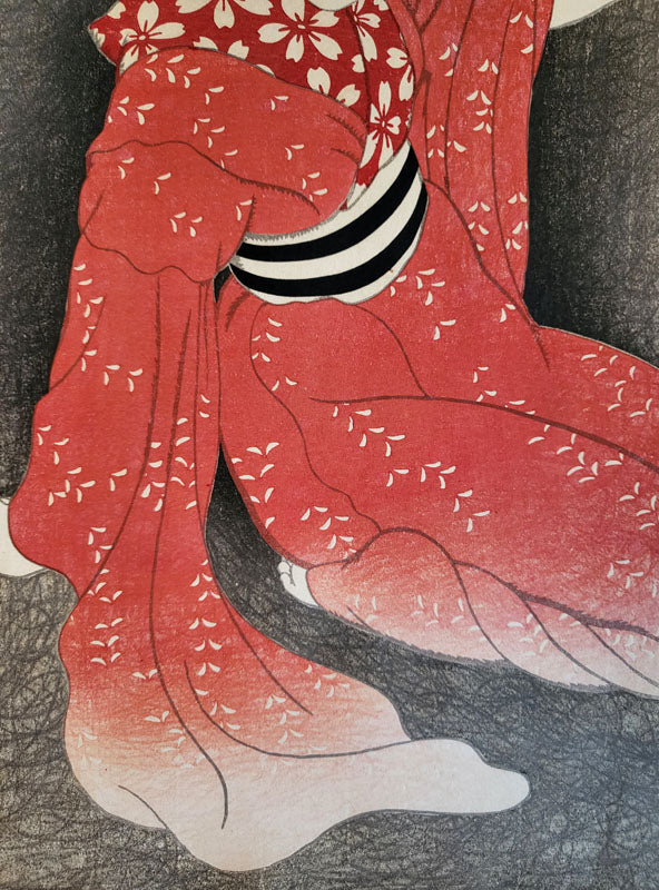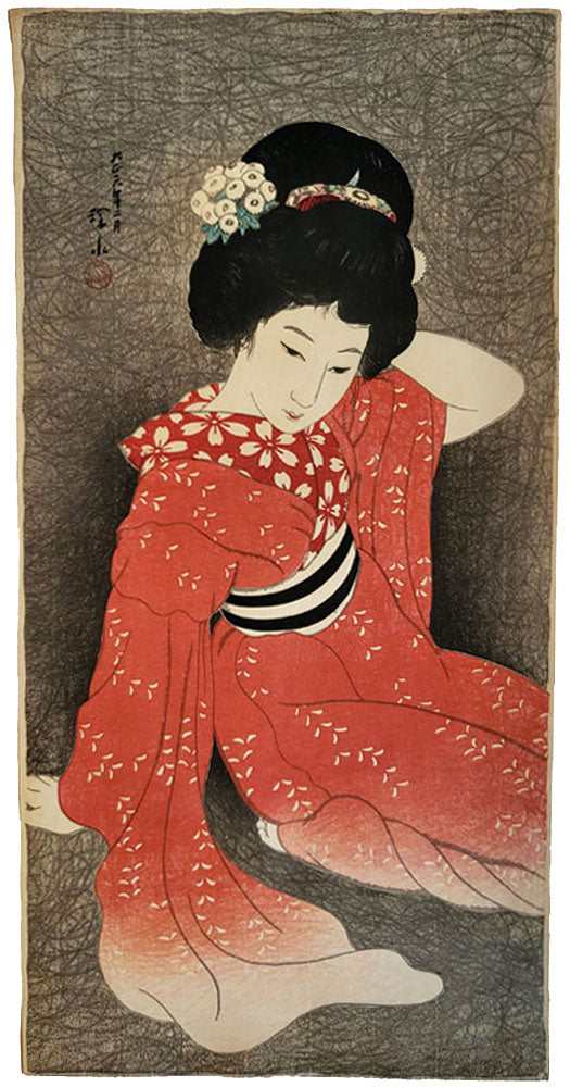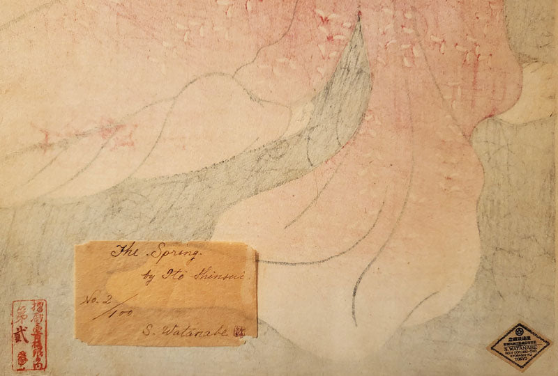 An extremely early impression (#2/100); with original paper label inscribed and sealed by the publisher S. Watanabe. Publisher's diamond label attached to the reverse. The barren marks in the background certainly add another element of design to this highly sought after work. An important and scarce shin-hanga bijin-e image.
