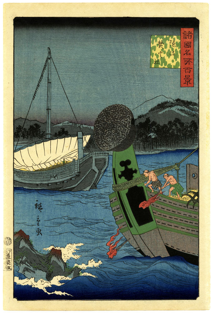 The series dates from the middle of Hiroshige II's career, when he was in his mid-thirties. At this point, he had just started using the name 'Hiroshige', since his master Hiroshige I had just died (in 1858), and Hiroshige II had taken over the gÅ 'Hiroshige'; the prints in this series are signed 'Hiroshige'.