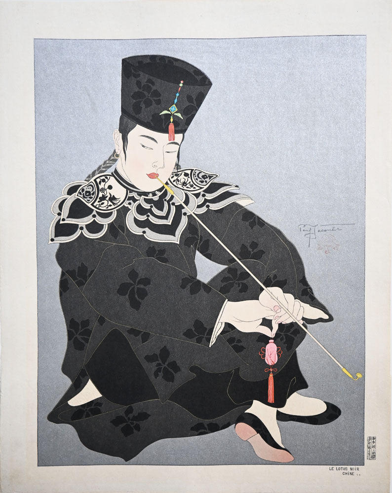 Miles notes: "This ambiguous image returns to Jacoulet's classic 'floating figure', but in an unsettling, modern way that is unlike anything else of the period. By this time the subscriber list was so scanty that there was little to fear from experimentation, and Jacoulet took advantage. All this energy was being poured into the exhausting new key-block drawings and color plans for the new series, and Honda was left quite alone." - Miles, pg. 125 p>