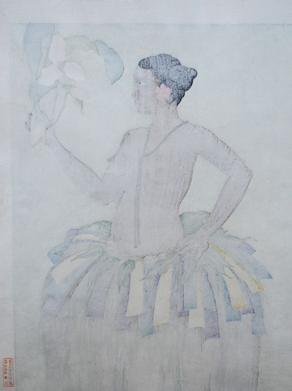 Notes: A first state, kanji edition (#104/150) limited edition seal on reverse. Completed with a silver mica background. Signed in pencil lower left above the Fan seal. Seal of the carver, Kazue Yamagishi, lower left. Published: December 10th, 1934.