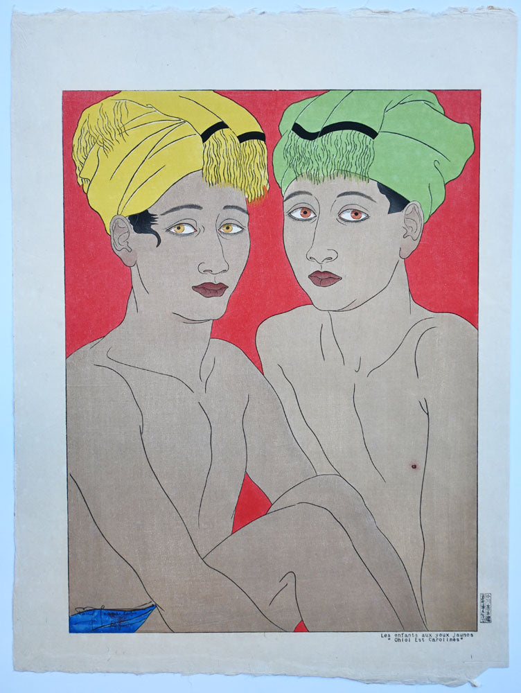 Notes: Carver: Maeda. Printers: Uchikawa, Ogawa. Although Jacoulet depicted his island models in full frontal poses often in his sketches, this is his first pair of figures that challenge the viewer in such a non-Japanese way. The unusual eye-tone make this simple design one of the artists most successful works.